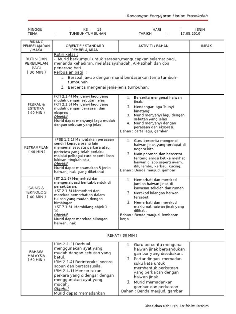 Pengasuh tu tunjukkan satu objek kepada bayi soft toys dan lihat reaksi bayi sekali lagi. Koleksi Rancangan Pelaksanaan Aktiviti RPA RANCANGAN PELAKSANAAN AKTIVITI MINGGU 2 Hari Khamis. 18112013 CONTOH RPH PRASEKOLAH bahasa inggeris Ismail Mamat.